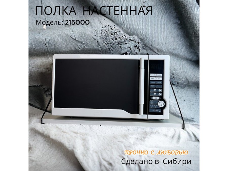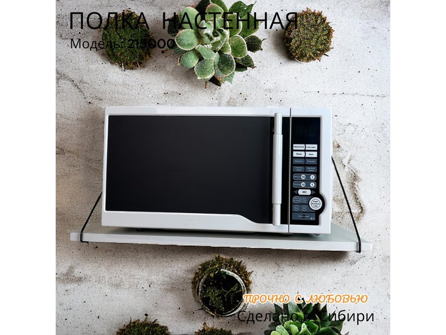 • Полка надежно крепится к стене при помощи анкеров или шурупов с дюбелями, на ней можно разместить микроволновую печь, кухонную технику, посуду, специи