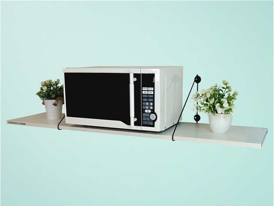 - Полка надежно крепится к стене при помощи анкеров или шурупов с дюбелями, на ней можно разместить микроволновую печь, кухонную технику, посуду, специи