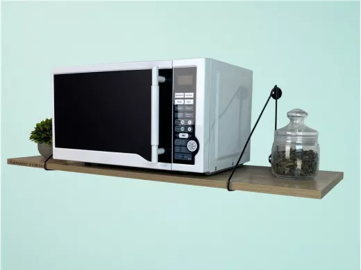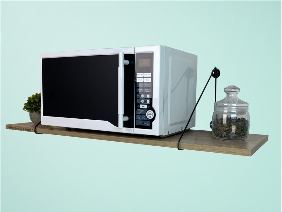 • Полка надежно крепится к стене при помощи анкеров или шурупов с дюбелями, на ней можно разместить микроволновую печь, кухонную технику, посуду, специи
