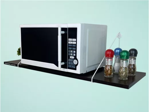 • Полка надежно крепится к стене при помощи анкеров или шурупов с дюбелями, на ней можно разместить микроволновую печь, кухонную технику, посуду, специи