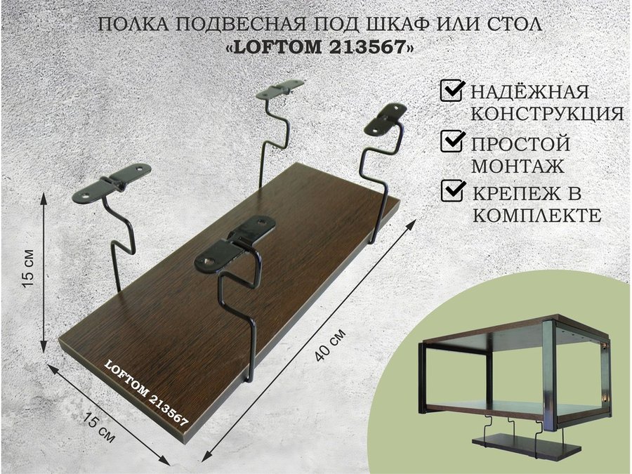 В корзину Купить в 1 клик Полка подвесная под шкаф или стол черная, 40х15 см, венге "LOFTOM 213567" высота 15см