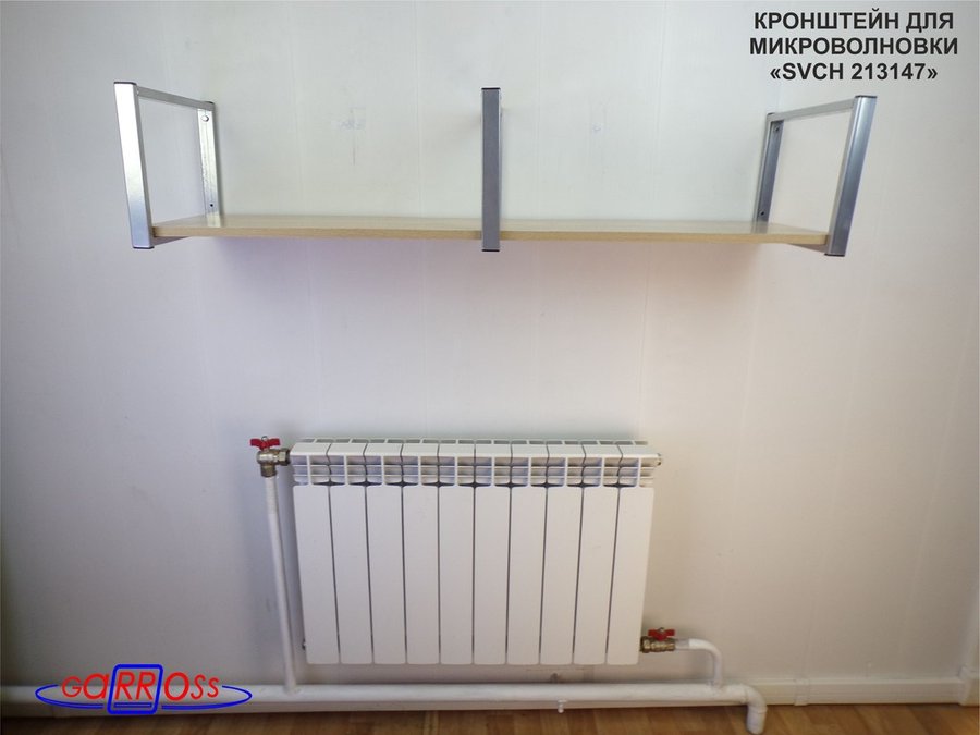• Полка надежно крепится к стене при помощи анкеров или шурупов с дюбелями, на ней можно разместить микроволнрвую печь, кухонную технику, посуду, специи
