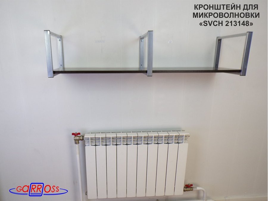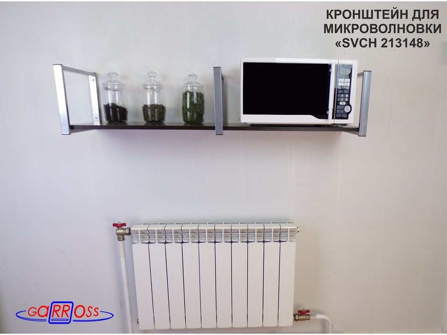 • Полка надежно крепится к стене при помощи анкеров или шурупов с дюбелями, на ней можно разместить микроволнрвую печь, кухонную технику, посуду, специи