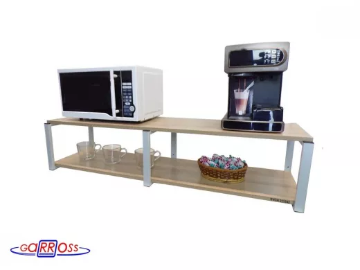 • Полка надежно крепится к стене при помощи анкеров или шурупов с дюбелями, на ней можно разместить микроволнрвую печь, кухонную технику, посуду, специи