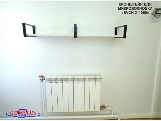 • Полка надежно крепится к стене при помощи анкеров или шурупов с дюбелями, на ней можно разместить микроволнрвую печь, кухонную технику, посуду, специи