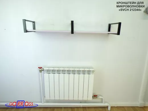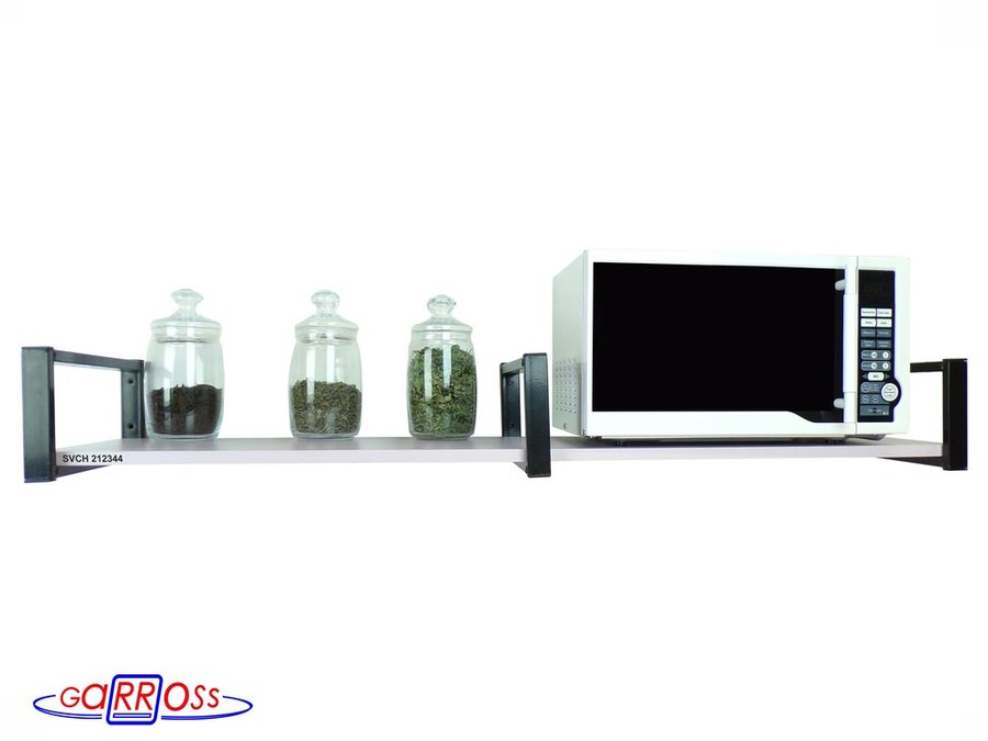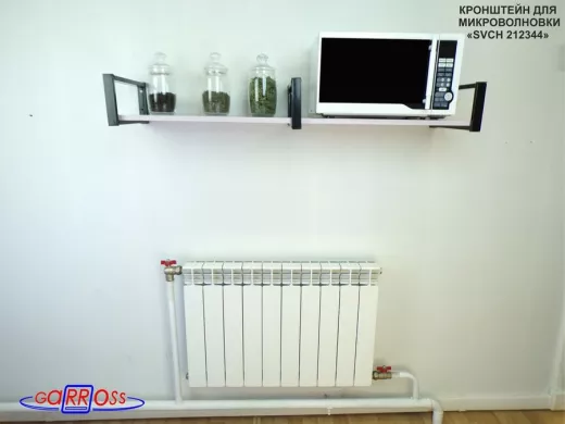 • Полка надежно крепится к стене при помощи анкеров или шурупов с дюбелями, на ней можно разместить микроволнрвую печь, кухонную технику, посуду, специи