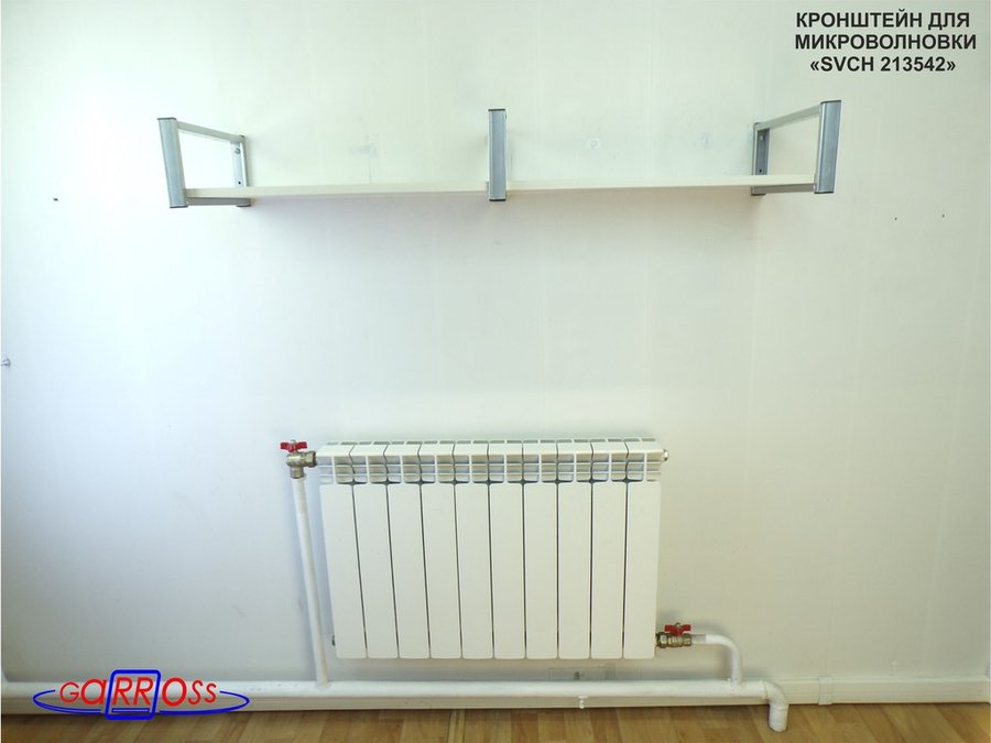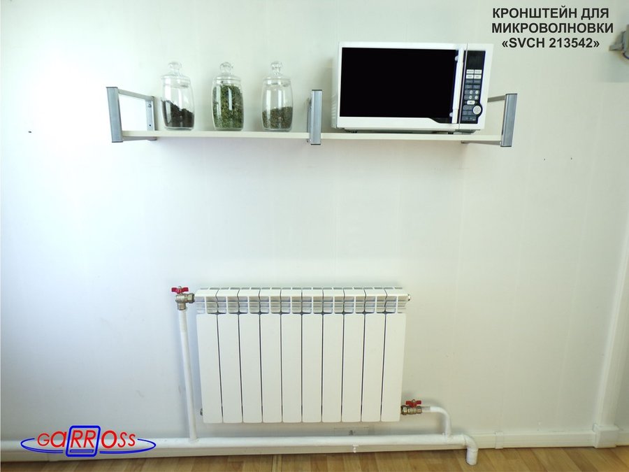 • Полка надежно крепится к стене при помощи анкеров или шурупов с дюбелями, на ней можно разместить микроволнрвую печь, кухонную технику, посуду, специи