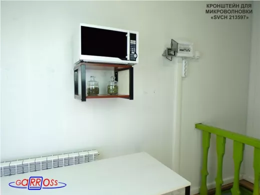 • Полка надежно крепится к стене при помощи шурупов с дюбелями, на ней можно разместить микроволновую печь, тостер, кофемашину, чайник, посуду, специи