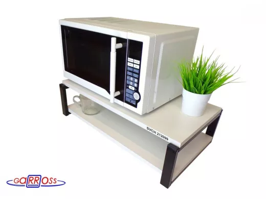 • Полка надежно крепится к стене при помощи анкеров или шурупов с дюбелями, на ней можно разместить микроволновую печь, кухонную технику, посуду, специи