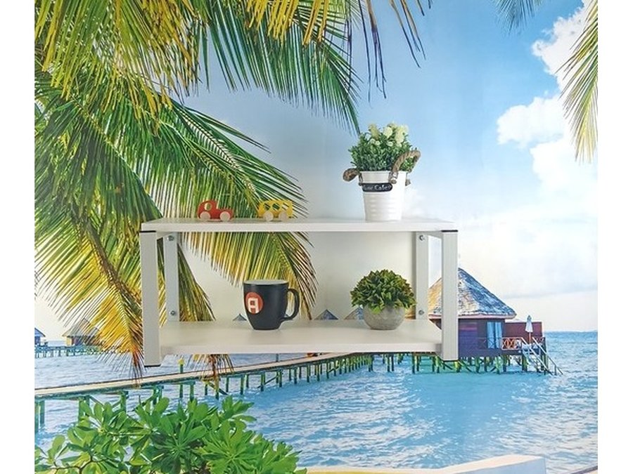 - Полка надежно крепится к стене при помощи анкеров или шурупов с дюбелями, на ней можно разместить микроволнрвую печь, кухонную технику, посуду, специи