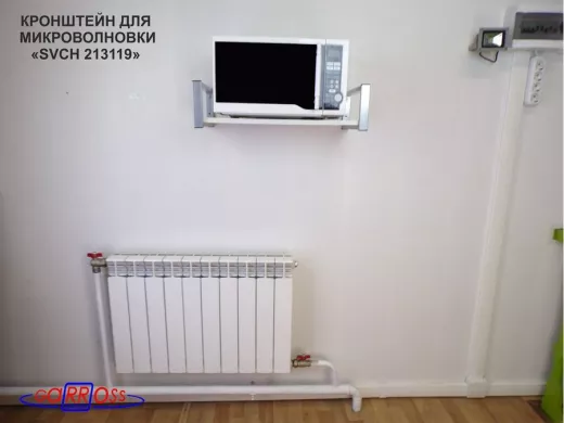 • Полка надежно крепится к стене при помощи анкеров или шурупов с дюбелями, на ней можно разместить микроволновую печь, кухонную технику, посуду, специи