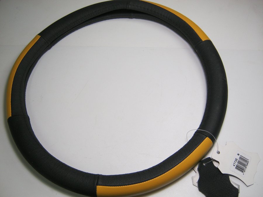 В корзину Купить в 1 клик Оплетка на руль 38 см. M 4773E кожа черная+желтая кожа вставка сверху "гладкая"