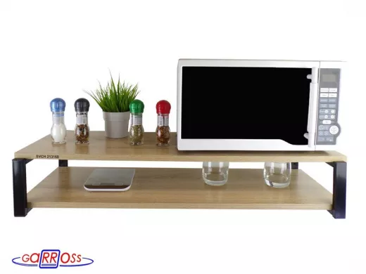 • Полка надежно крепится к стене при помощи анкеров или шурупов с дюбелями, на ней можно разместить микроволнрвую печь, кухонную технику, посуду, специи