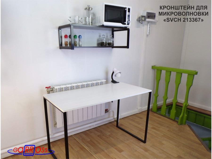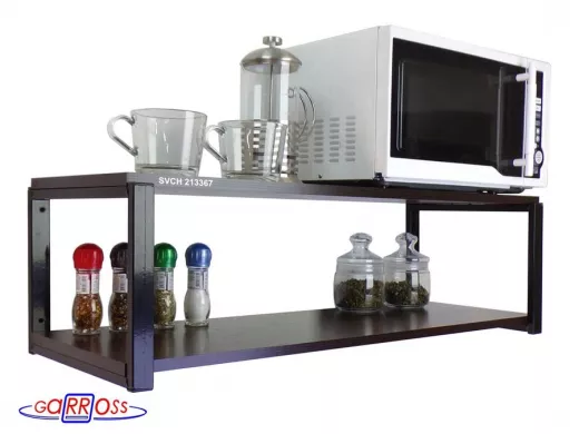 • Полка надежно крепится к стене при помощи анкеров или шурупов с дюбелями, на ней можно разместить микроволновую печь, кухонную технику, посуду, специи