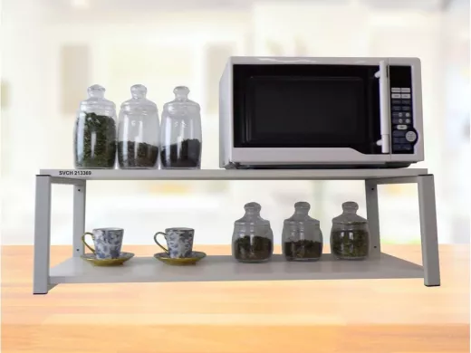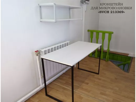 • Полка надежно крепится к стене при помощи анкеров или шурупов с дюбелями, на ней можно разместить микроволновую печь, кухонную технику, посуду, специи