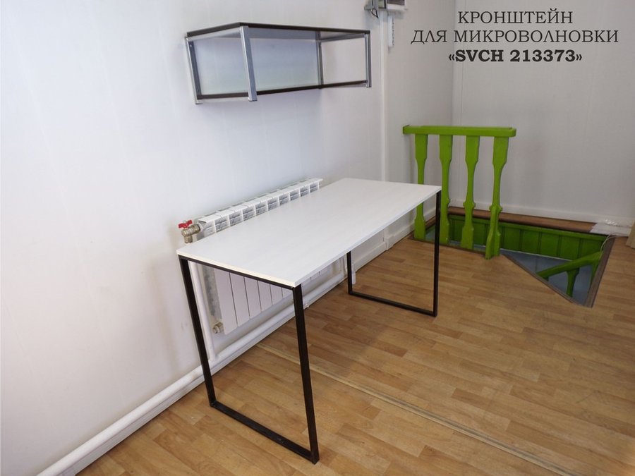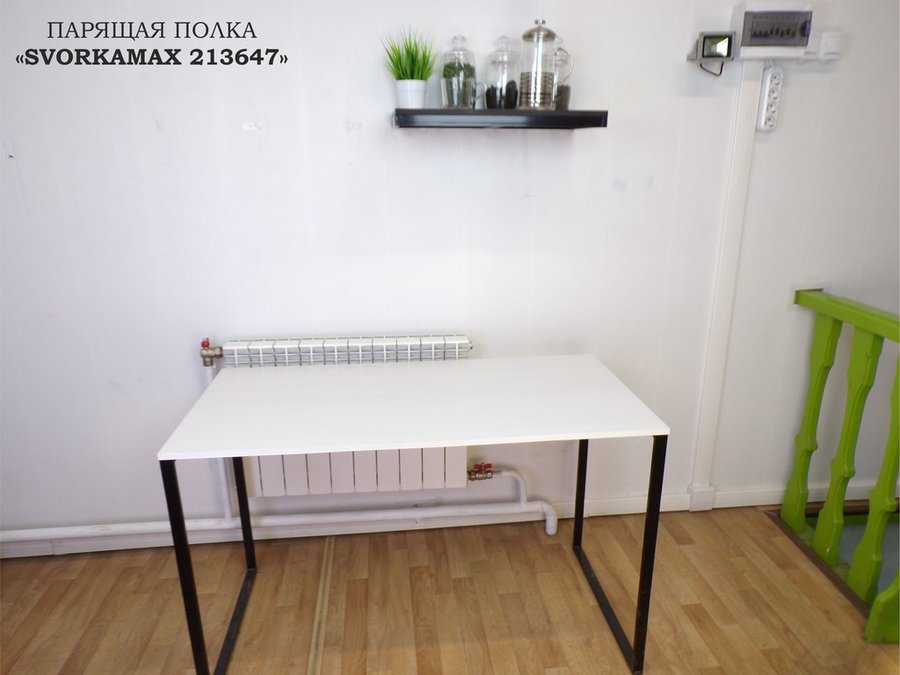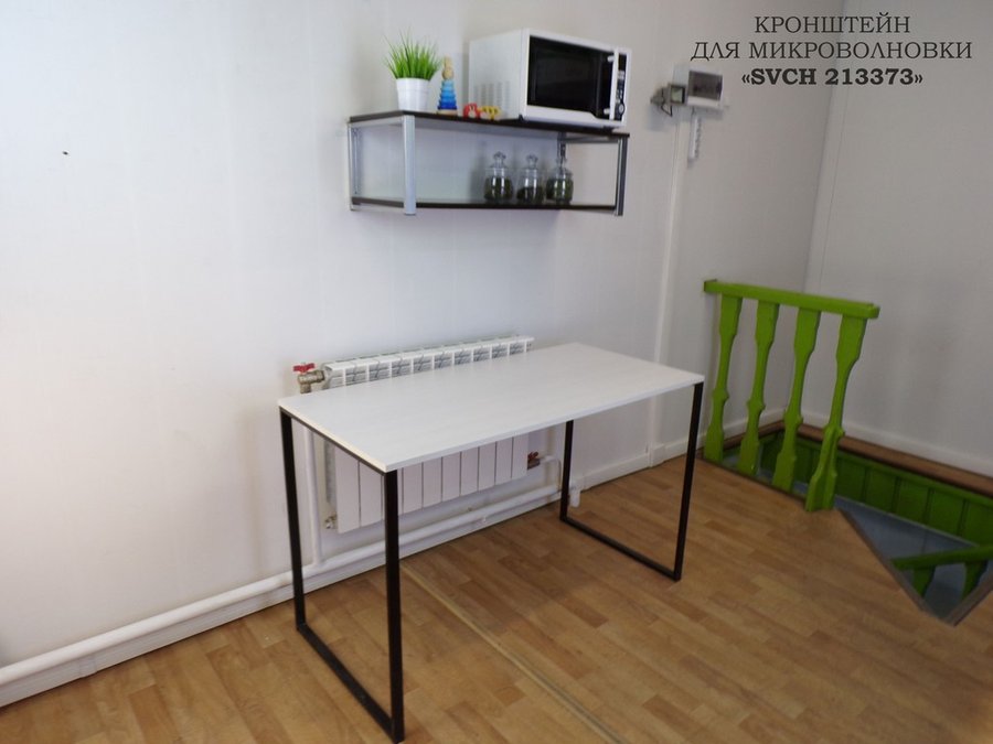 • Полка надежно крепится к стене при помощи анкеров или шурупов с дюбелями, на ней можно разместить микроволновую печь, кухонную технику, посуду, специи