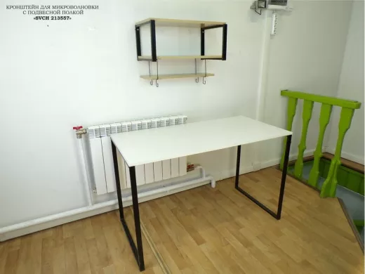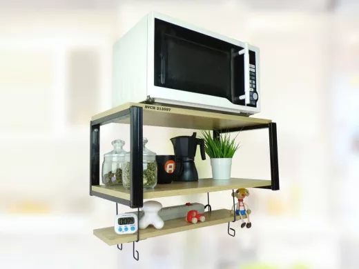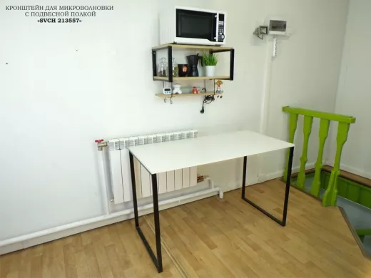 • Полка надежно крепится к стене при помощи анкеров или шурупов с дюбелями, на ней можно разместить микроволновую печь, кофемашину, тостер идр.кухонную технику, посуду, специи, различные необходимые мелочи