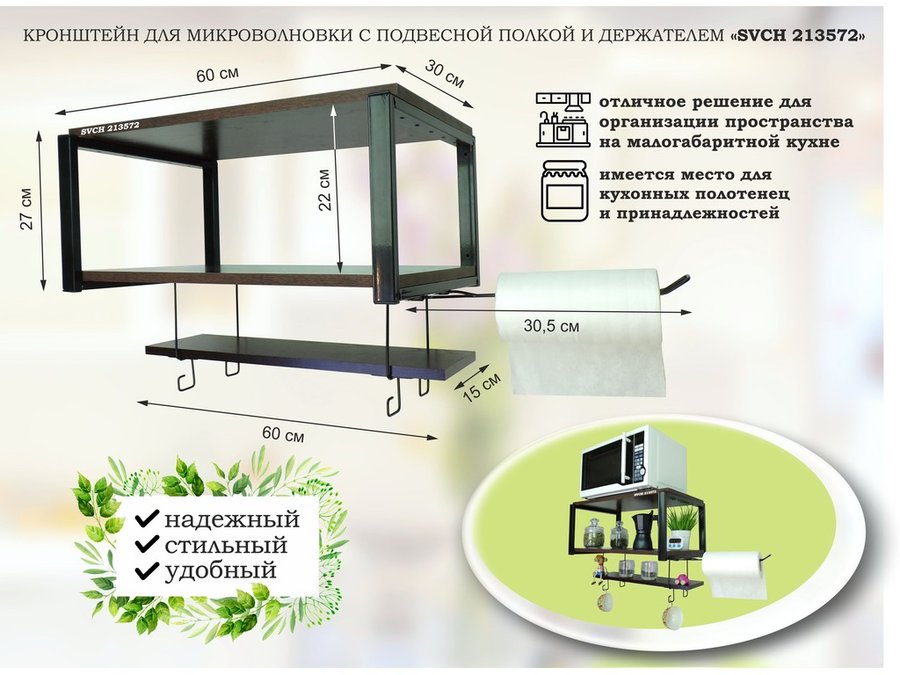 В корзину Купить в 1 клик Полка для микроволновки с подвесной полкой, 27см, черный "SVCH 213572" 60х30см, венге, держатель