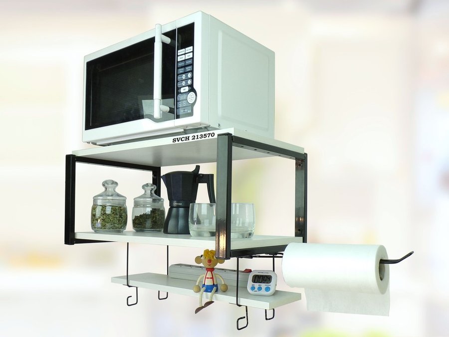 • На верхней полке можно разместить микроволновую печь или другую кухонную технику, на средней отлично "встанет" посуда, баночки под сыпучее и многое другое, а нижняя полка отлично подойдет для специй, таймера или маленьких сувениров