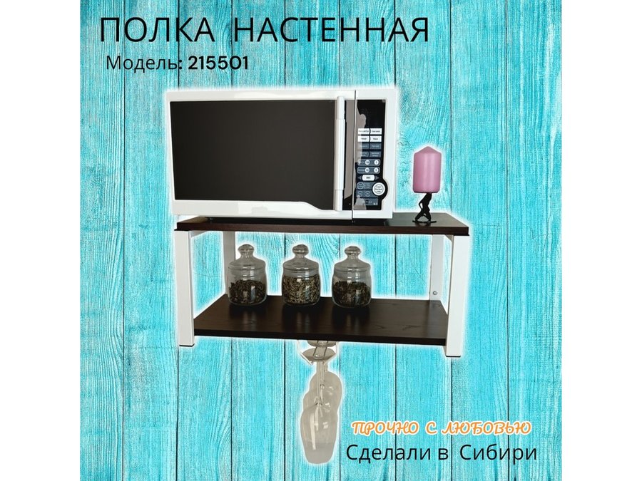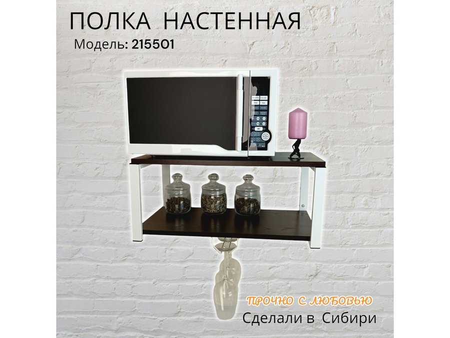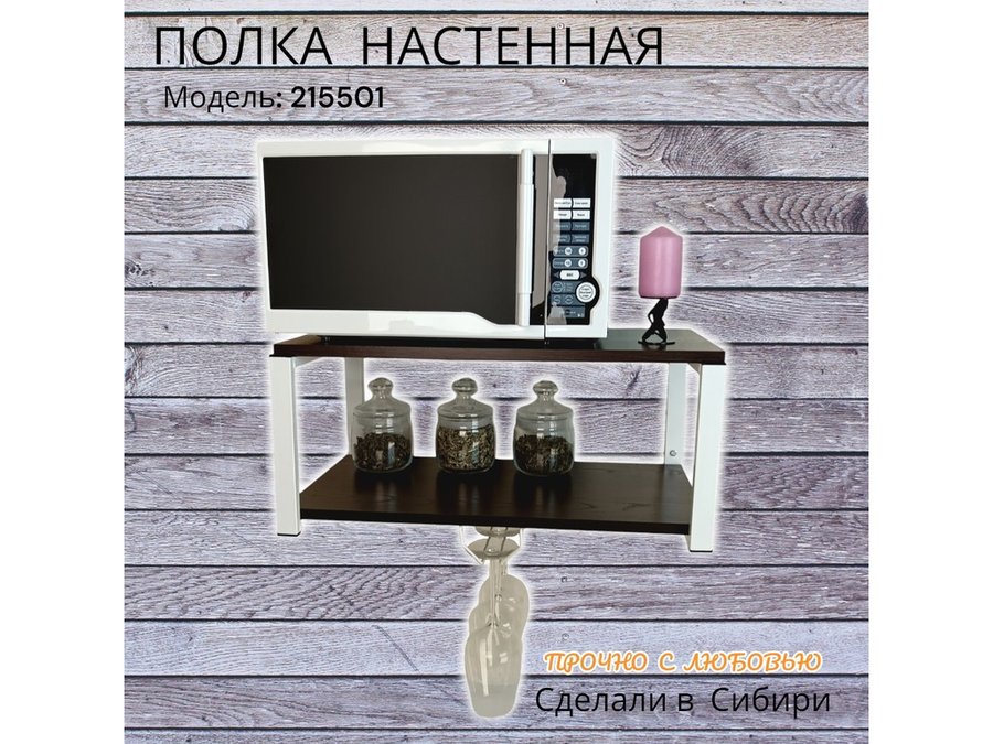 • Полка надежно крепится к стене при помощи анкеров или шурупов с дюбелями, на ней можно разместить микроволновую печь, кухонную технику, посуду, специи