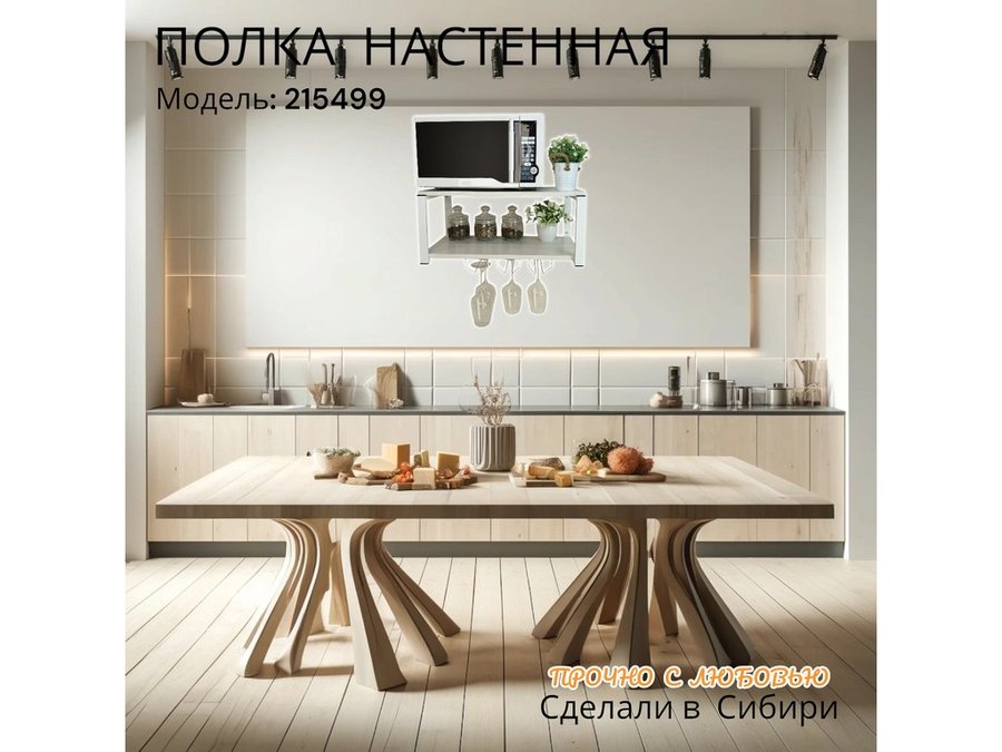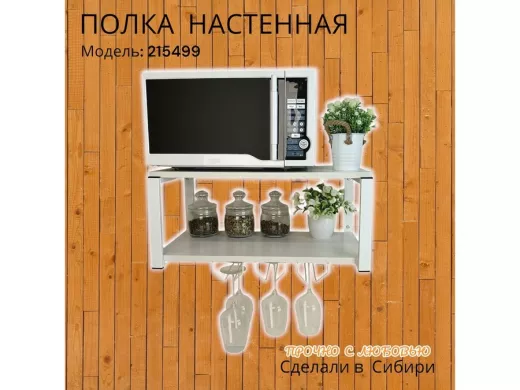• Полка надежно крепится к стене при помощи анкеров или шурупов с дюбелями, на ней можно разместить микроволновую печь, кухонную технику, посуду, специи