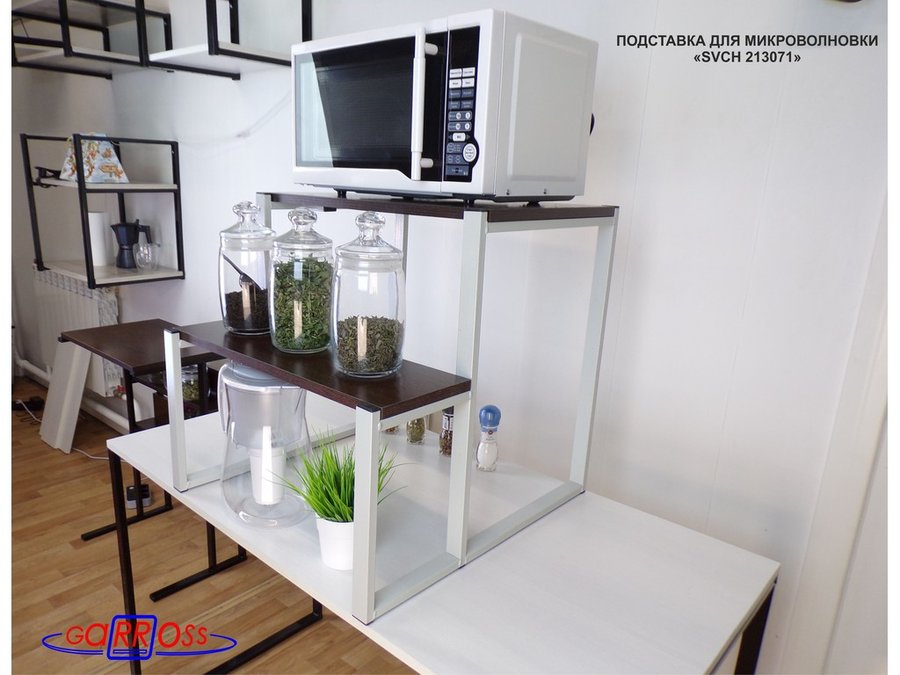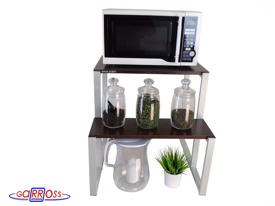 - Универсальная подставка для бытовой техники (микровоновой печи, кофемашины, тостера, электрического чайника и др) позволяет эффективно использовать место на столе.