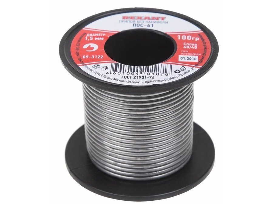 В корзину Купить в 1 клик Припой (катушка) ПОС-61 без канифоли (O1,5 мм, 100 г) REXANT