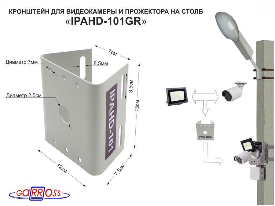 В корзину Купить в 1 клик Кронштейн для 1 камеры и прожектора на столб, прочная сталь 2мм серый "IPAHD-101GR-122418" под ленту